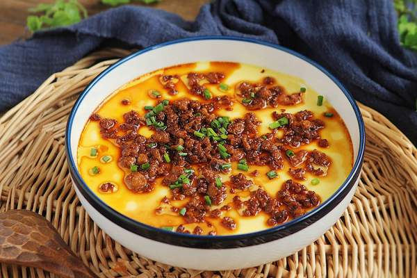 Cho dầu vào chảo, xào chín thịt bằm rồi rải lên trứng đã hấp.