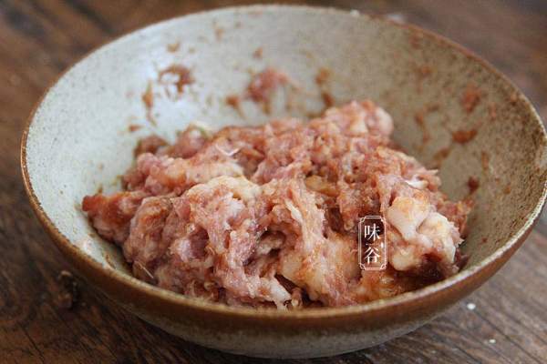 Nấm hương ngâm nước cho nềm rồi băm nhuyễn, trộn với thịt băm, nước tương, tiêu, đường.