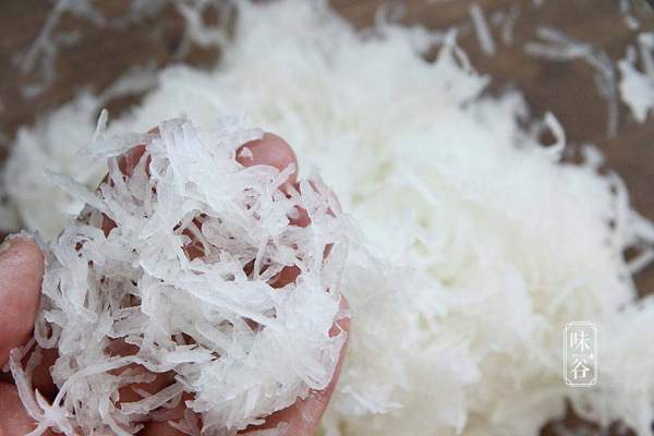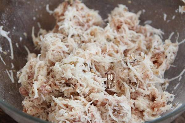 Củ cải gọt vỏ, bào thành sợi nhỏ, cho một chút muối vào ướp trong 10 phút, sau đó vắt khô rồi trộn với một ít bột năng.