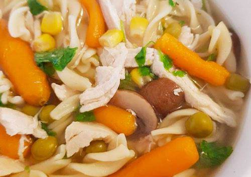 Chuẩn bị 200g ức gà, rau rải, cà rốt, gia vịLọc lấy thịt ức gà, phần xương cho vào ninh 20 phútThịt ức gà rửa sạch, thái vừa miếng rồi ướp gia vị trong 10 phútCho ức gà vào đảo chín rồi tắt bếpRửa sạch rau củ rồi thái khúcSau khi ninh xương ức gà, cho rau củ vào cùng rồi đun thêm 5 phút thì cho ức gà đã xào vàoCho canh ức gà vào bát rồi sử dụng.
