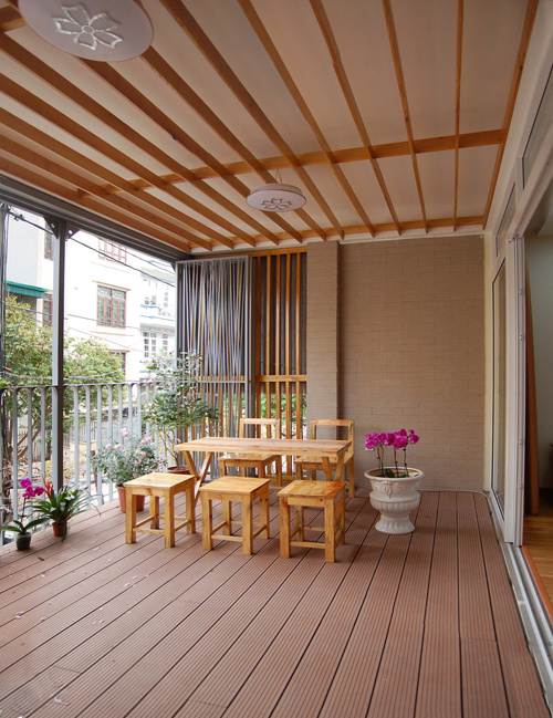 Ban công không chỉ đủ chỗ kê bàn ăn ngoài trời, trồng cây cảnh mà còn có khoảng diện tích lớn cho trẻ chơi đùa.