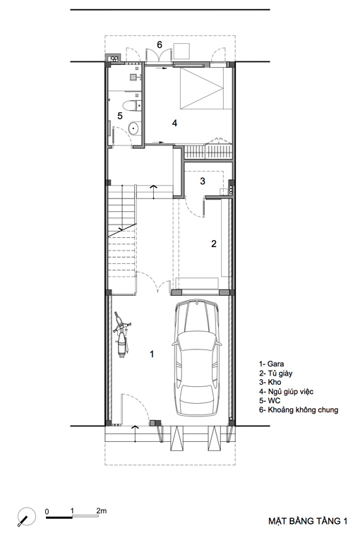 Các phòng đều được chiếu sáng tự nhiên nhờ cửa kính trước và sau cộng thêm giếng trời giữa nhà.