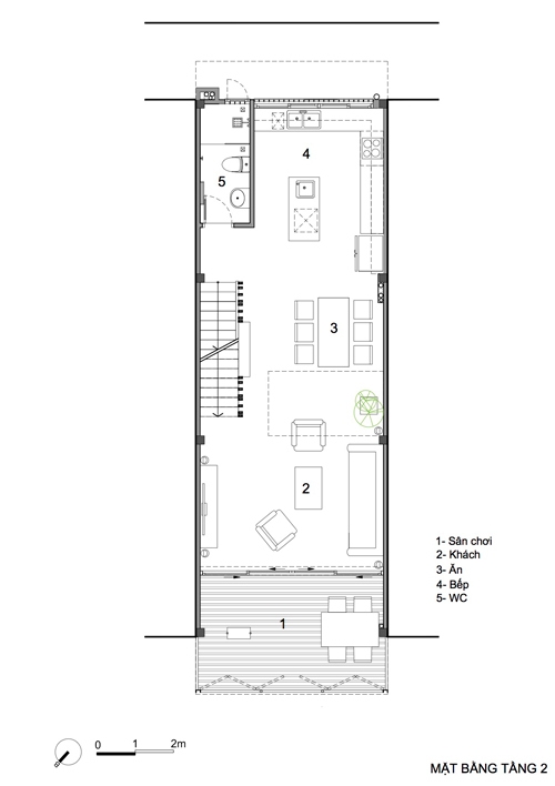 Không gian mở gồm phòng khách, bếp ăn, sân chơi trải dài trên toàn bộ diên tích tầng 2.