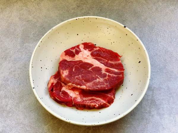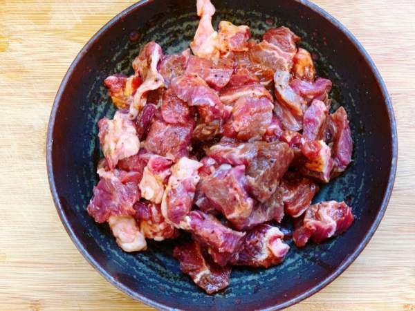 Bước 1: Bạn rửa sạch miếng thịt bò đã mua và để ráo nước. Sau đó, dùng khăn giấy nhà bếp để thấm khô nước. Bạn nên chọn phần thịt đầu vai bò sẽ mềm, thích hợp để nướng hoặc rán. Thái thịt thành từng khối vuông nhỏ, chiều dài khoảng 2-3cm và chiều rộng từ 1-2cm tùy theo sở thích.