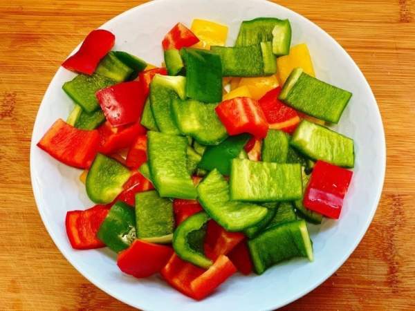 Bước 3: Trong khi ướp thịt bò, bạn rửa sạch ớt chuông và để ráo nước. Nên chọn những quả ớt to đều và rất tươi ớt sẽ ngọt và thơm. Cắt đôi từng quả ớt rồi bỏ lõi, sau đó cắt thành kích cỡ tương tự như miếng thịt bò. Phần xiên tre bạn nên ngâm với nước trước một lúc rồi đem chần qua nước sôi. Làm như vậy sẽ tiệt trùng cho xiên hơn nữa xiên tre hút nước sẽ không dễ bị cháy khi nướng.