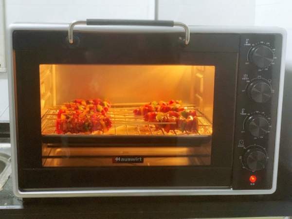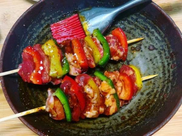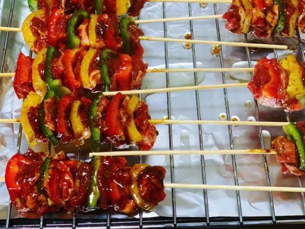 Bước 5: Sau khi xiên thịt và ớt xong, xếp thịt lên giá nướng có hứng khay đã lót sẵn lá nhôm bên dưới (để tránh nước thịt chảy xuống làm bẩn lò), quét một lớp dầu lên bề mặt xiên thịt bò. Sau đó cho thịt vào rãnh giữa của lò đã làm nóng trước 200 độ C, nướng trong vòng 10 phút. Sau đó lấy ra, dùng cọ phết lên các xiên thịt nước sốt ướp còn lại rồi cho vào lò nướng thêm khoảng 2-5 phút.