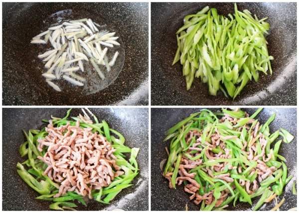 - Sau đó thêm ớt xanh vào xào một lúc cho ớt hơi chín tái rồi cho thịt lợn vào.