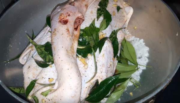 Lấy một chiếc nồi khác, rải muối trắng kín đầy nồi sao cho khi đặt vịt lên trên, da vịt không chạm trực tiếp vào thành nồi là được.