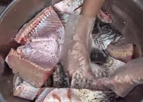 Rửa sạch và xắt cá xong bắt đầu ướp gia vị. Riềng và nghệ giã nhỏ vắt lấy nước cho vào cá, rau mùi thái nhỏ, sả ớt thái nhỏ. Cho hỗn hợp nước mắm,nước riềng, nước nghệ, hạt thì là, hạt tiêu, ớt, sả, rau mùi vào bóp với cá, bóp đều để cá ngấm khoảng 1 tiếng.