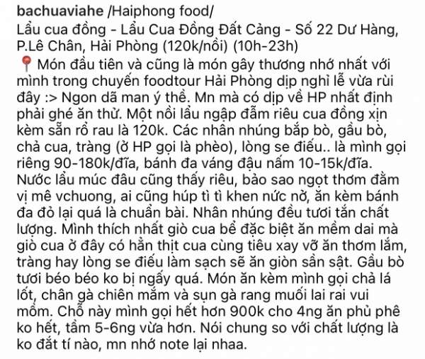 Đồng ý tưởng với Sở Du Lịch Hải Phòng rằng đêm nên thao thức cùng lẩu cua đồng, Food Blogger Bà Chúa Vỉa Hè vừa đáp xuống Hải Phòng đã đến ngay lẩu cua đồng Đất Cảng - 22 Dư Hàng trải nghiệm. Với giá chỉ từ 120 nghìn/nồi, cô dùng nhiều mỹ từ để khen món gây thương nhớ nhất cho mình trong chuyến đi.