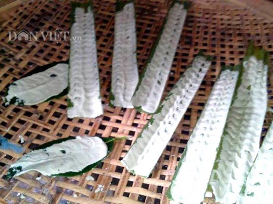 Chế bột lên lá dừa và chuẩn bị đem đi hấp.