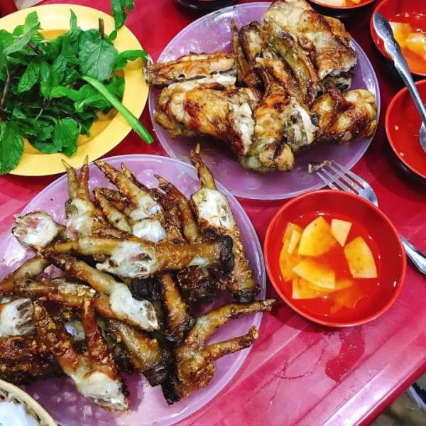 Ngoài món thịt chim thì chân gà được chế biến theo nhiều kiểu như rán, trộn sả tắc, nướng,... cũng là mồi nhậu rất đắt khách. Món này thường được bán kèm với dưa leo, rau thơm và đồ chua. (Ảnh minh họa)