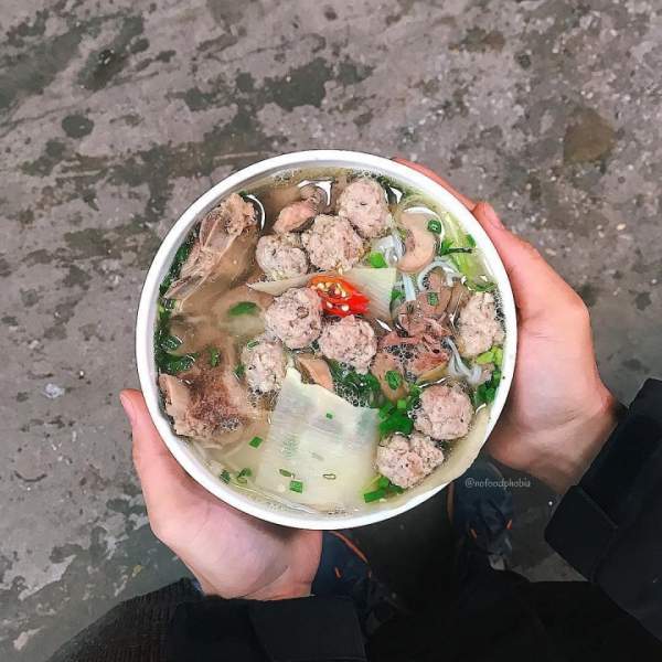 Không chỉ có những món ăn nhanh, ở Tạ Hiện còn có hàng bún mọc phục vụ cho những "cú đêm" đói bụng. Nước bún ninh từ xương, nấu kèm với măng chua nên ngọt thanh, không bị ngán. Phần mọc ăn béo, ngậy lại có chút dai dai, sật sật của mộc nhĩ. (Ảnh: @nofoodphobia)