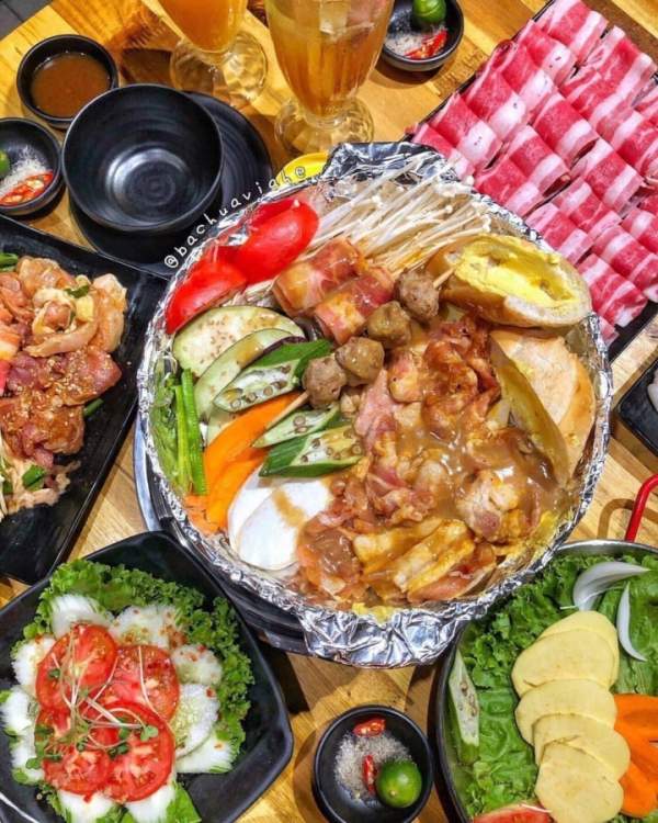 Nếu đi theo nhóm đông người, bạn nên chọn một quán bò nướng chảo gang. Bò ở đây thường được nướng cùng với sốt me hoặc sốt trứng muối, ngoài ra còn có đậu bắp, nấm kim châm, nấm đùi gà, cà tím,... ăn cùng với bánh và rau sống. (Ảnh minh họa)