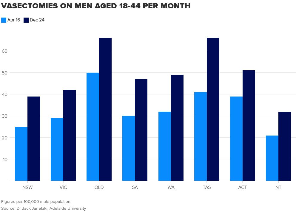 Năm 2016 có khoảng 18,500 ca được thực hiện ở nhóm tuổi này, nhưng đến năm 2024 con số đã vượt mức 29,800. Tại bang NSW, tỷ lệ triệt sản nam trung bình hàng tháng tăng từ 25 lên 39 ca trên mỗi 100,000 nam giới, còn ở Tasmania tăng từ 41 lên 66 ca. Các chuyên gia cho rằng áp lực giá nhà, chi phí sinh hoạt leo thang và xu hướng kết hôn muộn có thể khiến nhiều người trẻ tuổi quyết định giới hạn hoặc không sinh con.