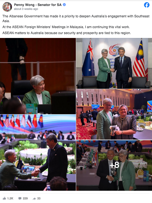 Ngoại trưởng Úc Penny Wong cam kết Úc sẽ luôn là đối tác đáng tin cậy của các nước Đông Nam Á, và Canberra sẽ tiếp tục làm sâu sắc hơn quan hệ kinh tế trong khu vực, đồng thời giữ khoảng cách với cách tiếp cận bảo hộ thương mại của Mỹ. “Chúng tôi hiểu rằng tăng cường thương mại với Đông Nam Á sẽ mang lại nhiều việc làm hơn, thêm đầu tư và một nền kinh tế Úc mạnh mẽ, bền bỉ hơn”, bà Wong phát biểu tại Kuala Lumpur hôm 11/07.