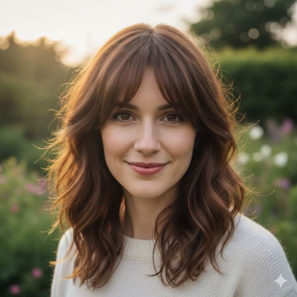 Sự kết hợp giữa tóc ngang vai và mái thưa từ lâu đã được xem là “công thức” giúp diện mạo trông trẻ hơn một cách an toàn. Phần mái mỏng, có độ bay tự nhiên giúp gương mặt bớt góc cạnh, đồng thời tạo cảm giác mềm mại và gần gũi.