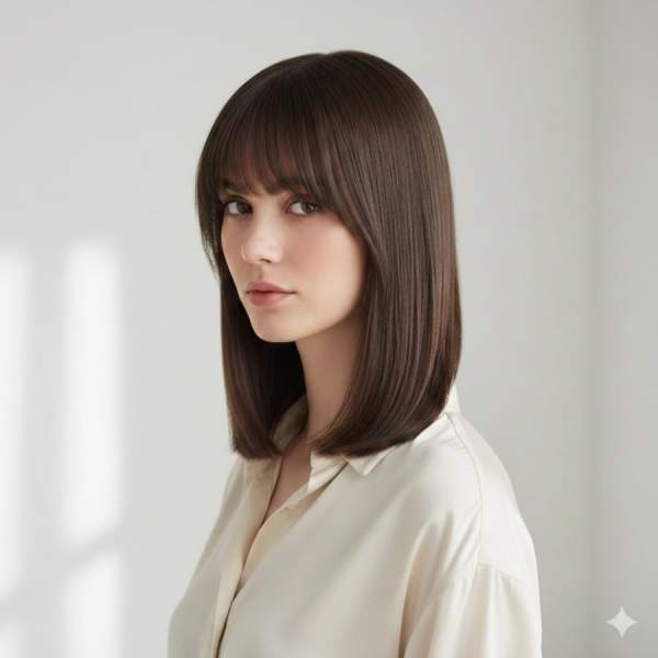 Tóc ngang vai suôn thẳng mang lại vẻ ngoài tối giản, hiện đại, dễ ứng dụng trong nhiều hoàn cảnh.
