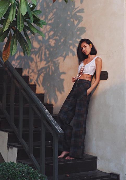 Minh Triệu gợi cảm trong thiết kế bra-top, quần ống rộng hoạ tiết caro.