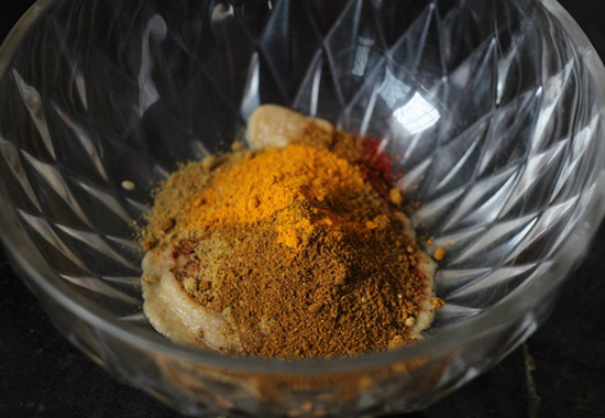 Bước 2: Làm nước ướp gồm hành tây cho vào máy xay xay nhuyễn sau đó cho ra tô thêm 1 muỗng bột ngò, 1/2 muỗng bột ớt, 1 muỗng muối, xíu đường, xíu bột ngọt trộn đều.