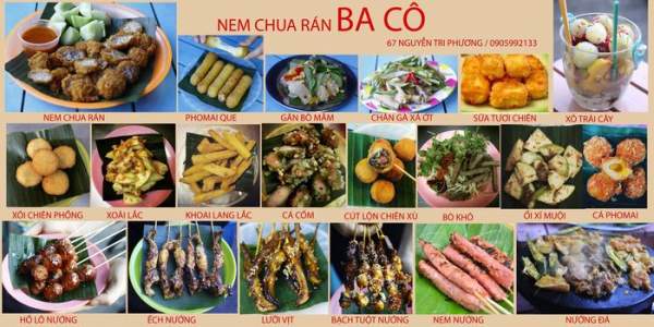 Các món ăn vặt Đà Nẵng ở Ba Cô là những món hot và rất được lòng các bạn trẻ. Có thể kể tên một vài món như xoài lắc, sữa tươi chiên, gỏi khô bò, gà sả ớt, các món nướng như ếch nướng, bạch tuộc nướng... Đồ ăn đều rất tươi và hương vị vừa ăn. Giá các món không quá 25k.
