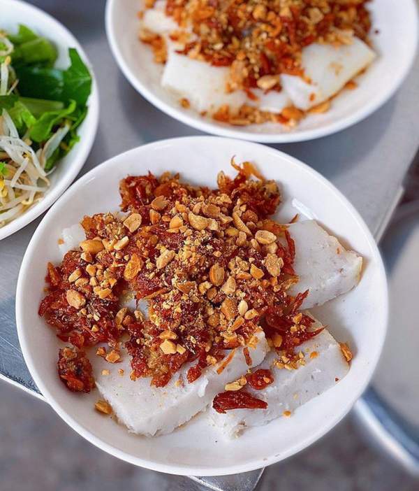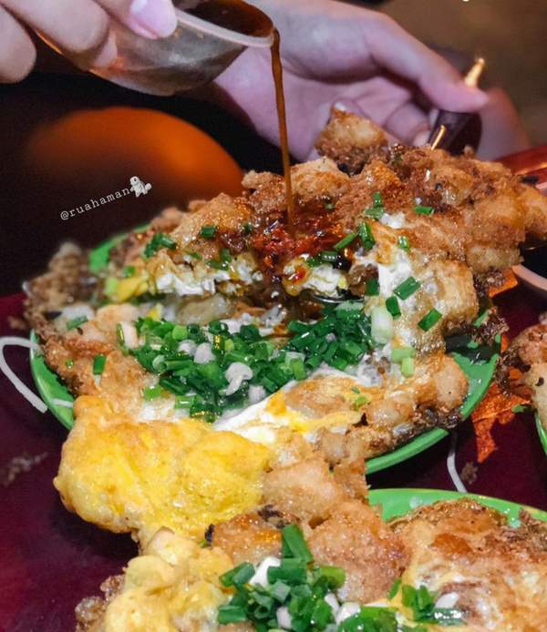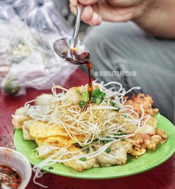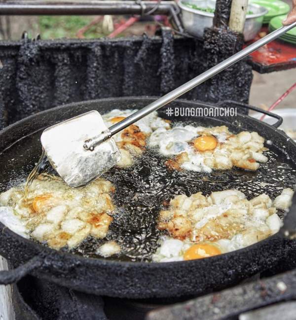 Các nguyên liệu của phần bột chiên vẫn bao gồm những viên bột vuông vức, trứng gà, hành lá cắt nhỏ, đu đủ bào sợi và nước tương pha loãng. Điểm đặc biệt của món ăn chính là viên bột luôn được chiên với lửa thật lớn để giòn đều cả 2 mặt mà không quá ngấm dầu, ăn không bị ngấy. Đặc biệt hơn, phần trứng gà sau khi đập vào cùng bột cũng được chiên giòn chứ không mềm như những nơi khác. Tuy nhiên, nước chấm ở đây không thiên về vị ngọt, nên thay vì chan ngập vào phần bột chiên, bạn nên chấm riêng sẽ "ổn áp" hơn.
