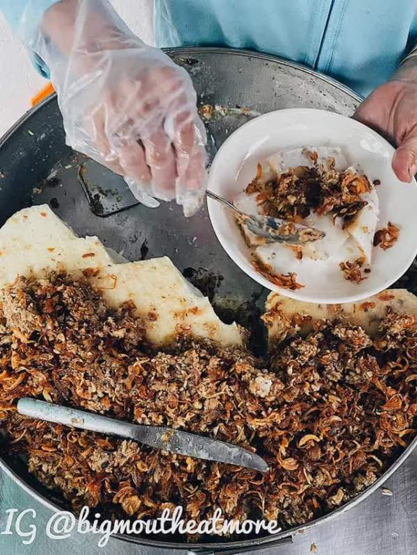 Bánh bột sẽ được hấp trong những chiếc xửng inox, bên trên trải đầy thịt băm xào cùng củ sắn, mộc nhĩ và hành phi. Khi có khách đến mua, chị chủ sẽ múc từng miếng to cho vào đĩa, thêm 1 ít rau sống, giá đỗ và chan thêm nước mắm tỏi ớt. Riêng bánh bột khoai môn sẽ có vị béo và mùi thơm đặc trưng. Vì là bánh bột kiểu người Hoa nên bánh sẽ khá ẩm, độ mềm tương tự món bánh nậm ở miền Trung nhưng không mịn mà có chút lợn cợn của hạt gạo. Khi ăn, phần bánh béo thơm kết hợp cùng thịt xào nêm nếm ngọt và nước mắm mằn mặn dễ gây "nghiện".