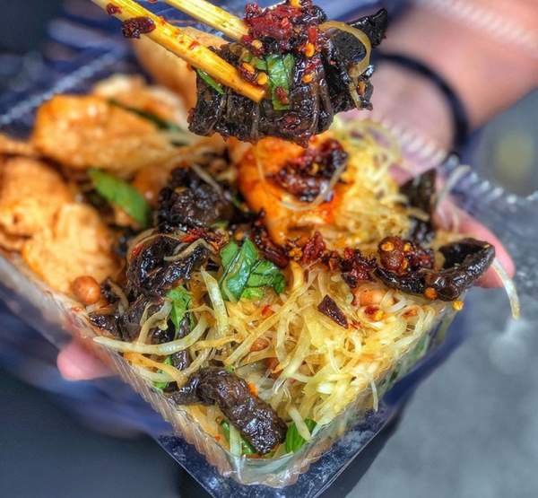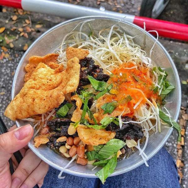 Một phần gỏi khô bò của dì Thuý khá đơn giản, chỉ có vài nguyên liệu quen thuộc như đu đủ bào sợi, bánh phồng tôm chiên giòn, khô bò đen dẻo, đậu phộng, rau răm. "Ăn điểm" nhất chính là phần nước sốt với vị mặn ngọt cân bằng, trộn cùng các nguyên liệu khác tạo nên hương vị rất "cuốn". Tất cả các nguyên liệu trong gỏi khô bò cũng do tự tay dì Thuý làm nên mùi vị không lẫn với những nơi khác. Nếu bạn là fan cứng của gỏi khô bò thì nên đến đây ăn thử nhé.