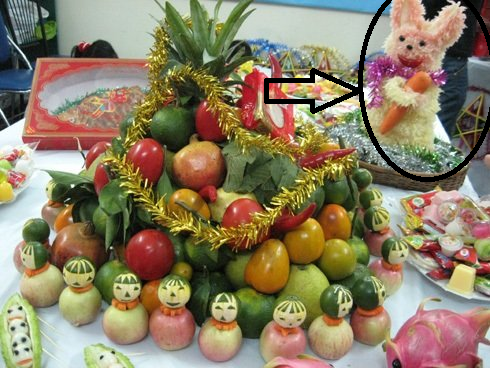 Ngoài ra, để làm cho mâm ngũ quả độc đáo hơn, những ai khéo tay có thể tự cắt tỉa các hình thù đẹp bắt từ các loại quả quen thuộc như những chú chó từ tép bưởi, những chú thỏ, heo làm từ quả bưởi, những chú cá từ quả thanh long, hình lật đật từ ổi, cam, hồng...