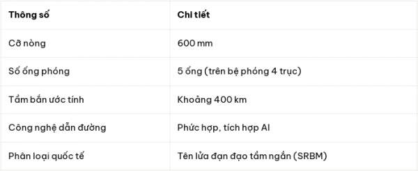 Các cơ quan tình báo Mỹ và Hàn Quốc phân loại hệ thống 600mm của Triều Tiên vào nhóm tên lửa đạn đạo tầm ngắn (SRBM) dựa trên khả năng dẫn đường và tầm bắn. Dưới đây là các thông số kỹ thuật chính dựa trên dữ liệu phân tích: