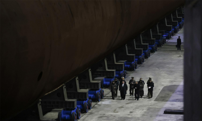Các bức ảnh cho thấy ông Kim Jong-un cùng quan chức đi bên cạnh một phương tiện có dạng hình trụ, nhiều khả năng là tàu ngầm hạt nhân đang thi công. Trong những ảnh còn lại, lãnh đạo Triều Tiên xuất hiện bên cạnh tàu hộ vệ có lượng giãn nước ước tính 3.000 tấn và được trang bị bệ phóng tên lửa thẳng đứng.
