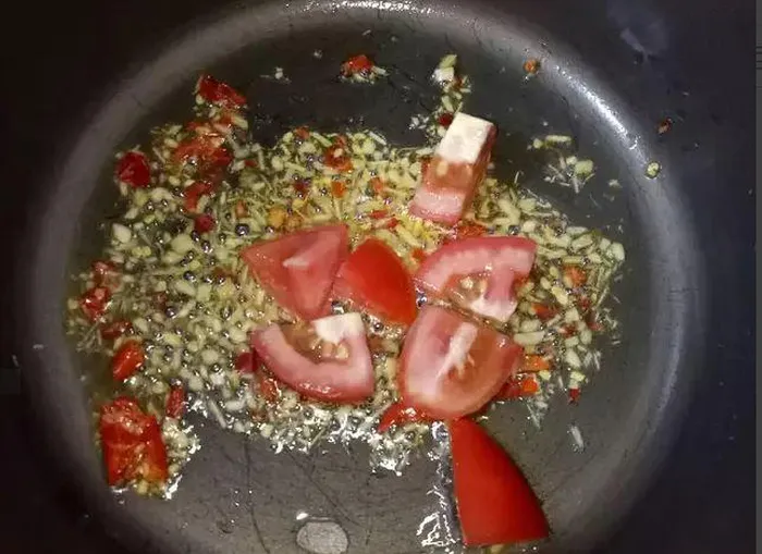 - Cho vào nồi 1 muỗng canh dầu ăn, dầu nóng cho sả băm vào phi thơm, cho cà chua xào chín.