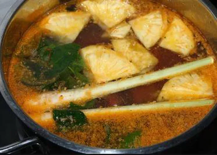 - Cho vào nồi 1,5 lít nước, thêm sả đập dập, dứa, 1 muỗng nước cốt me vào nấu sôi sau đó nêm nếm lại gia vị cho chua ngọt vừa ăn.