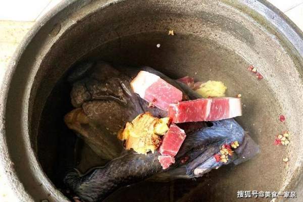 Lấy một cái nồi khác, vớt gà bỏ sang, thêm thịt muối.