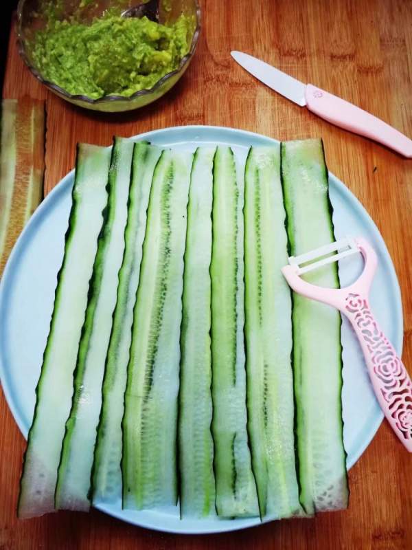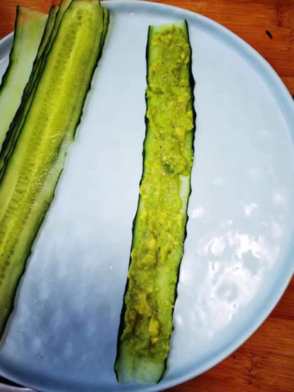 Lấy 1 dải dưa chuột, để lên đũa sau đó phết đều hỗn hợp quả bơ dầm nhuyễn lên rồi cuộn dải dưa chuột lại cho dến hết, say đó nhẹ nhàng bày miếng dưa chuột lên đĩa.