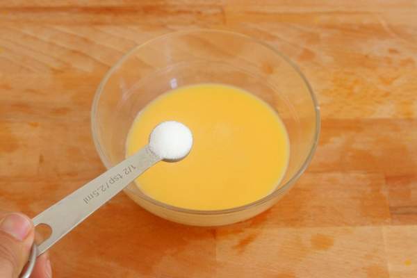 Đập 2 quả trứng vào bát, dùng rây lọc lấy trứng, sau đó cho 1g muối vào trộn đều. Lưu ý, nên lọc trứng qua rây để khi chiên trứng sẽ rất mịn.