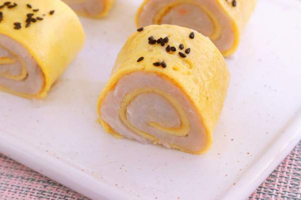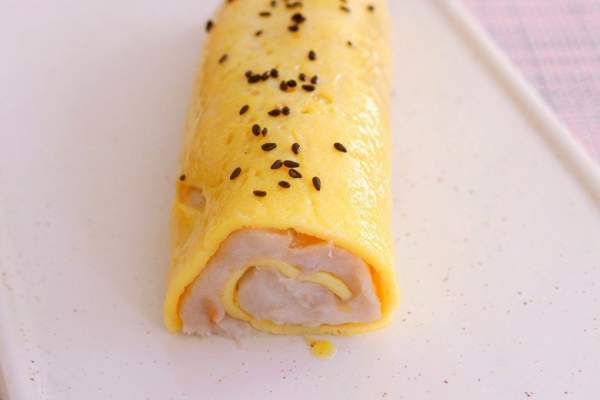 Cuộn trứng lại sau đó rắc vừng lên trên.