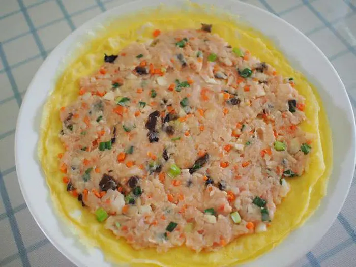 Xếp miếng trứng ra đĩa phẳng sau đó phết một lớp mỏng nhân thịt vào trong lòng miếng trứng.