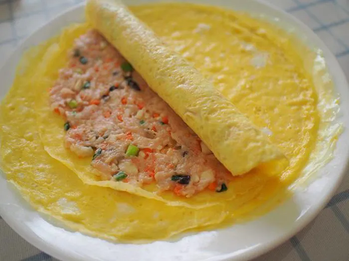 Sau đó nhẹ nhàng cuộn tròn lại. Thực hiện tương tự cho tới khi hết trứng và nhân thịt.