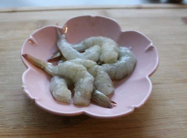 Tôm lột vỏ, bỏ chỉ đen, rửa sạch cho vào tô, thêm chút muối và bột gừng để ướp.