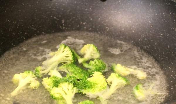 Rửa sạch súp lơ xanh. Cho một lượng nước vừa đủ vào nồi và đun sôi. Cho một thìa cà phê muối và vài giọt dầuăn vào nước sôi, sau đó chần súp lơ xanh trong 1 phút rồi vớt ra để sang một bên để nguội.
