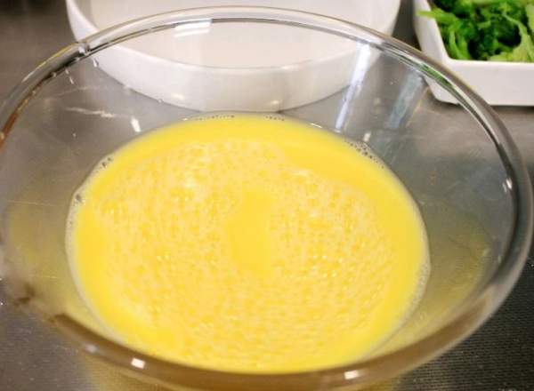 Đập 2 quả trứng cho vào bát, thêm chút muối, thêm 170 ml nước ấm và khuấy đều để tạo thành dung dịch trứng lỏng. (Tỉ lệ trứng với nước là 1: 1,5, nếu thích trứng hấp mềm hơn thì pha theo tỉ lệ 1: 2).