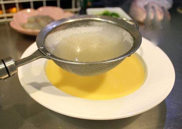 Rây dung dịch trứng đã đánh tan vào đĩa sâu lòng để món trứng hấp được mịn hơn.