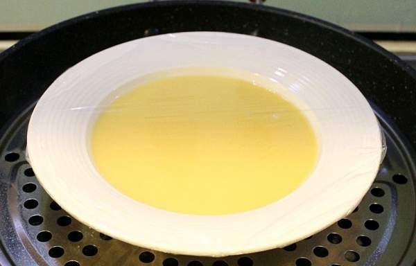 Đun sôi nước trong xửng hấp. Dùng màng bọc thực phẩm bọc kín bát trứng đã hấp, dùng tăm chọc vài lỗ khí rồi cho vào xửng hấp để hấp trong khoảng 10 phút.