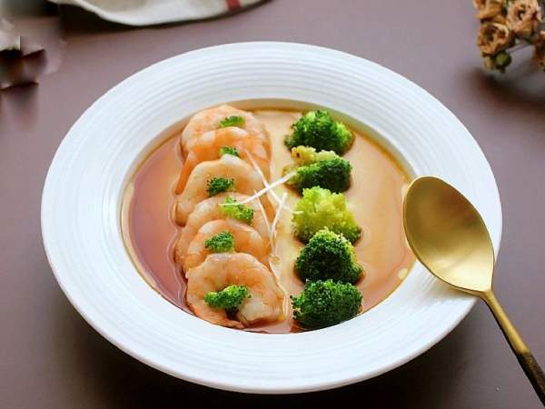 - 2 quả trứng, 6 con tôm, 45g súp lơ, một ít muối, 1 muỗng cà phê dầu ăn, 170ml nước ấm, nước tương, một ít bột gừng (không có thì dùng gừng tươi)