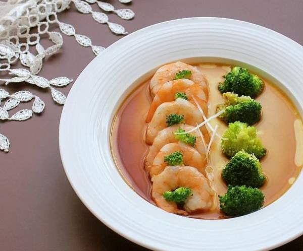 Mở màng bọc thực phẩm và xếp tôm, súp lơ vào đĩa trứng. Dùng màng bọc thực phẩm bọc lại và cho đĩa vào lại nồi hấp, tiếp tục hấp đến khi tôm chín hoàn toàn thì tắt bếp.