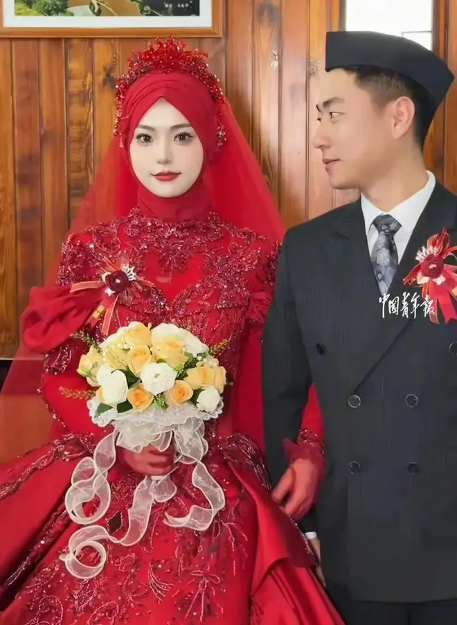 Trong lễ cưới hôm 26/4, cô dâu Ma Xiaoqing, 25 tuổi, mặc lễ phục truyền thống người Hồi gây ấn tượng với làn da mịn màng, gương mặt cân đối, sống mũi cao, mắt sâu.
