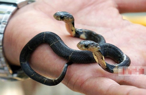 Gia đình ông Hoàng ở Ngọc Lâm, Quảng Tây, Trung Quốc đã làm nghề nuôi rắn hơn chục năm nay. Vừa qua, ông cùng công nhân nhà mình đi thu thập những con rắn từ đống trứng mới được ấp nở như thường lệ thì bất ngờ phát hiện một chú rắn hai đầu con rất đặc biệt. Đó là một con rắn hổ mang con hai đầu.