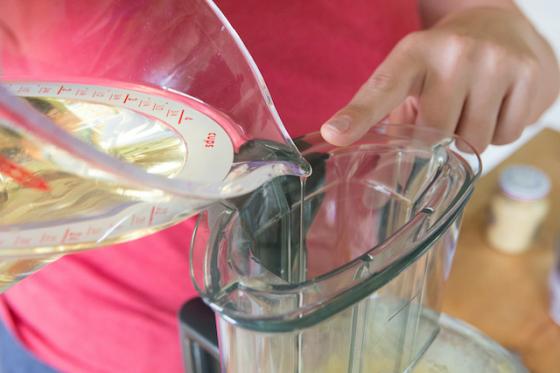 Bước 2: Từ từ thêm từng chút dầu vào cho đến khi được ¼ chỗ dầu. Lúc này hỗn hợp bắt đầu dày lên và đặc hơn. Tiếp tục thêm từng chút dầu vào cho đến khi hết.