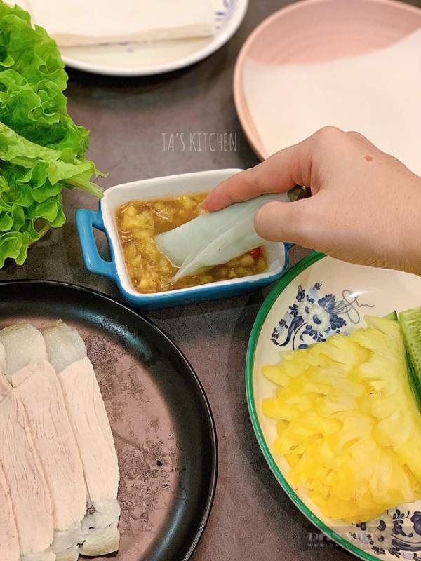 Cuối cùng chấm cuốn cùng với mắm nêm và thưởng thức.